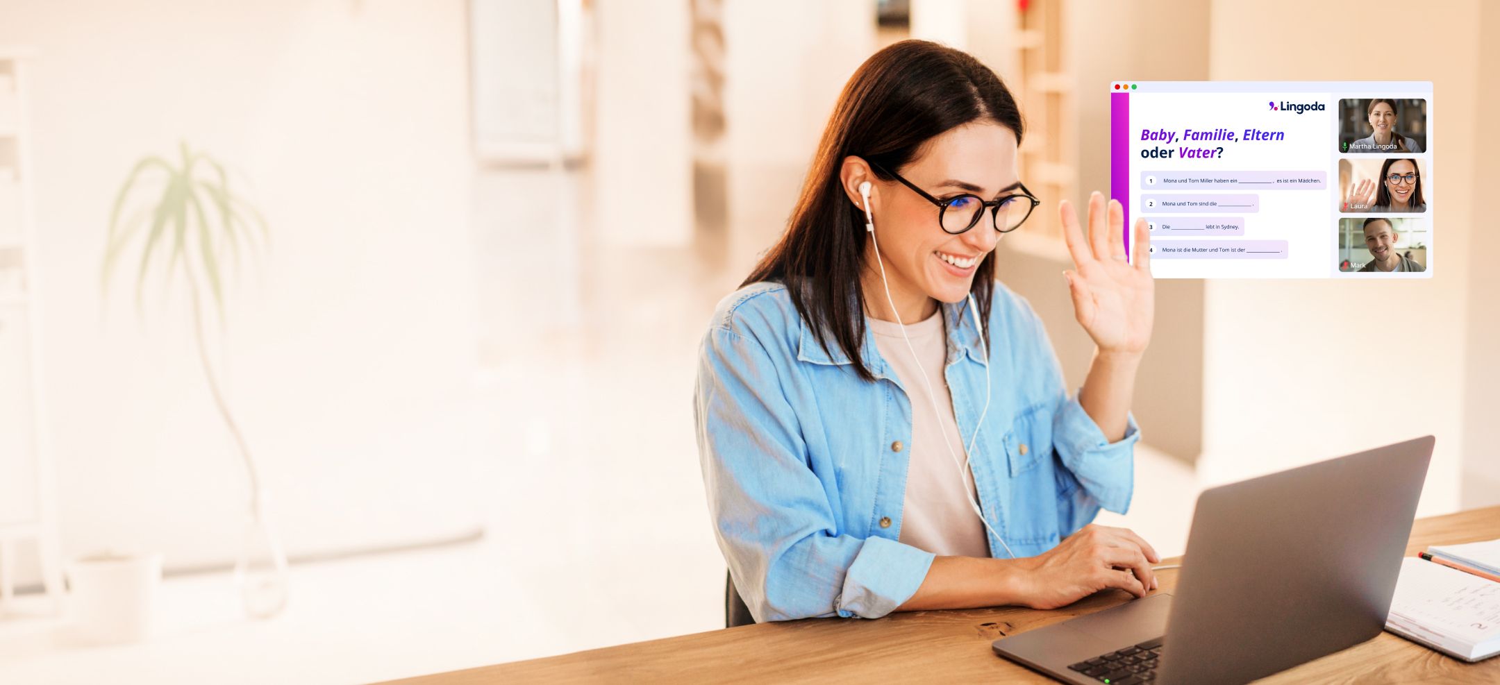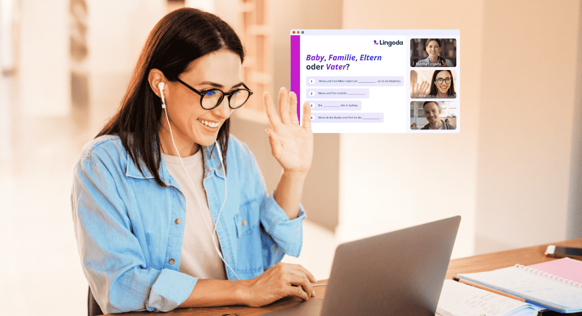 Agendas de trabalho ocupadas e responsabilidades familiares podem tornar extremamente difícil comparecer regularmente a aulas presenciais de alemão. No entanto, isso não significa que você não possa aprender alemão! Com as aulas online flexíveis da Lingoda, você pode participar de uma aula logo de manhã cedo, antes que todos estejam acordados, durante o horário do almoço ou entre as reuniões. É realmente tentador faltar a uma aula noturna após o expediente, mas se você puder fazê-lo a partir da mesa da cozinha, será muito mais provável que você participe regularmente.