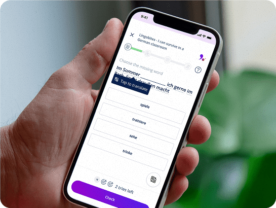 Gelernt wird bei uns nicht nur während des Unterrichts. In deinem Selbstlernbereich findest du smarte und personalisierte Übungswerkzeuge wie Karteikarten oder Lingobites. Du kannst auch unsere mobile App herunterladen, um jederzeit weiter zu üben, was du gelernt hast.
