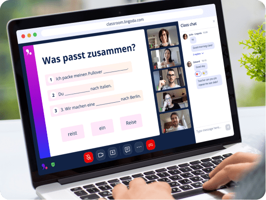 Der Online-Sprachunterricht bei Lingoda findet auf einer digitalen Plattform statt, auf der du Zugriff auf eine Vielzahl von Online-Lektionen hast. Teilnehmende können an Live-Unterrichtsstunden mit qualifizierten Lehrkräften auf muttersprachlichem Niveau teilnehmen und bekommen damit eine interaktive Lernerfahrung, die genauso funktioniert, wie der klassische Unterricht, nur mit mehr Flexibilität. In unseren Online-Unterrichtsstunden werden alle Aspekte der Sprache behandelt, inklusive Grammatik, Wortschatz, Aussprache und kulturelle Feinheiten. Dank dem digitalen Format kann der Sprachunterricht an die Zeitpläne der Teilnehmer angepasst werden. Damit ist das Sprachenlernen online eine bequeme und effektive Option für alle Lerntypen.