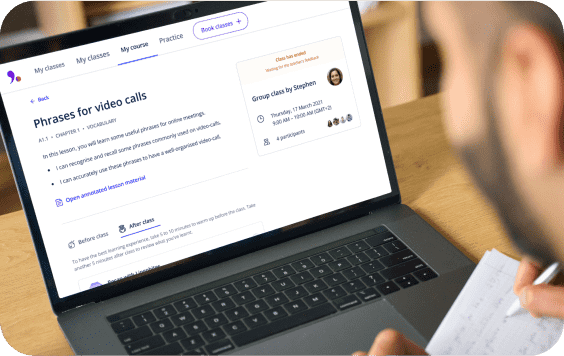 Unser Lernbereich ist auf allen Geräten und über unsere mobile App verfügbar. Du kannst Unterrichtsstunden buchen, Vokabeln wiederholen oder das Gelernte mit unseren interaktiven und KI-basierten Übungen üben.